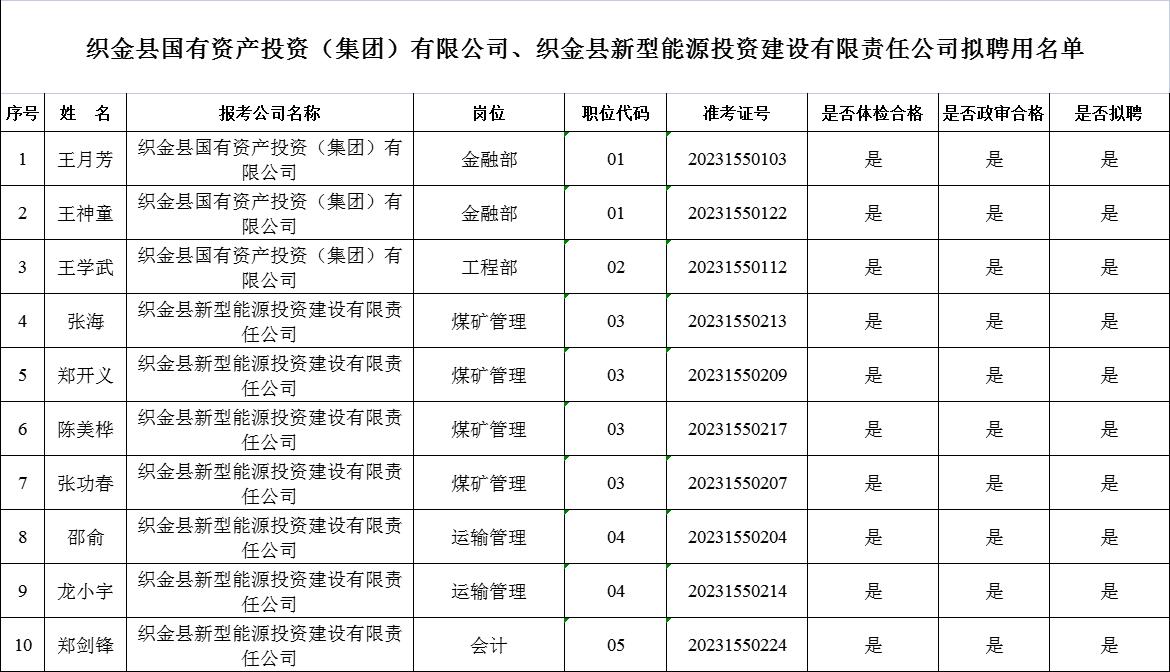 根據(jù)《織金縣國有資產投資(集團)有限公司、織金縣新型能源投資建設有限責任公司2023年面向社會公開招聘工作人員公告》,經過報名、筆試、面試、資格審查、體檢、政審等程序,現(xiàn)對擬聘用人(名單見附件1)予以公示。